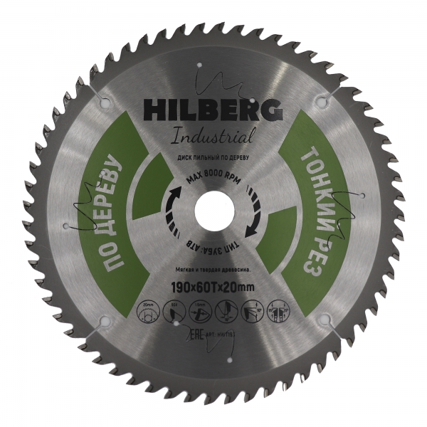 Диск пильный Hilberg Industrial Дерево Тонкий Рез 190x1,6x60Т*20мм